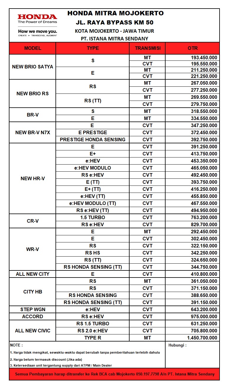 "Saya baru saja membeli Honda Brio dari Honda Mojokerto melalui Bapak Wahyu, dan pengalamannya luar biasa! Beliau sangat ramah dan sabar dalam menjelaskan setiap detail mobil serta pilihan pembiayaan yang tersedia. Saya merasa nyaman selama proses transaksi karena Pak Wahyu selalu responsif dan membantu setiap kali ada pertanyaan. Terima kasih, Pak Wahyu, atas pelayanan yang sangat memuaskan. Mobil baru saya benar-benar sempurna untuk kebutuhan sehari-hari!"
